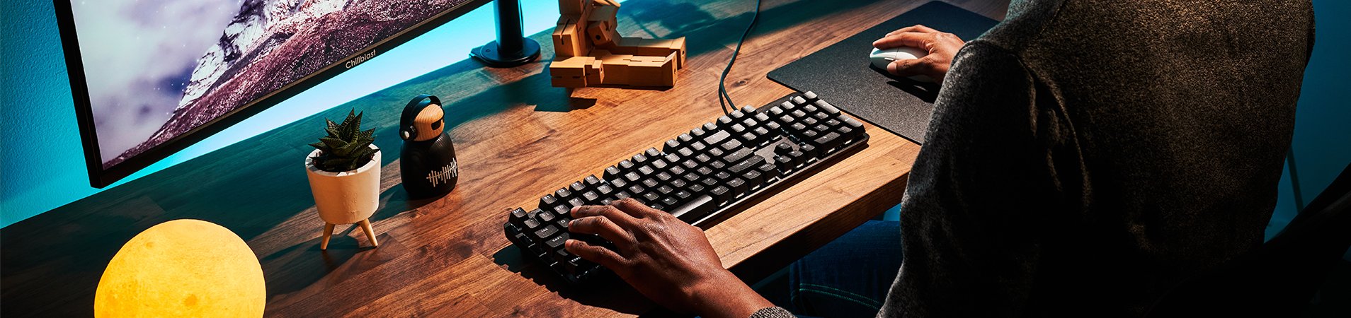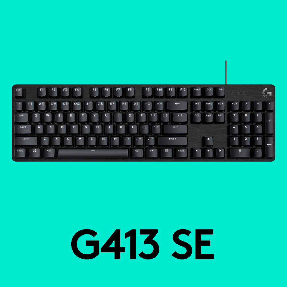 El teclado G413 SE ofrece el desempeño y la resistencia que requiere el entorno de competición, desde interruptores mecánicos táctiles a seguidilla de 6 teclas con prevención de efecto fantasma y teclas de PBT.