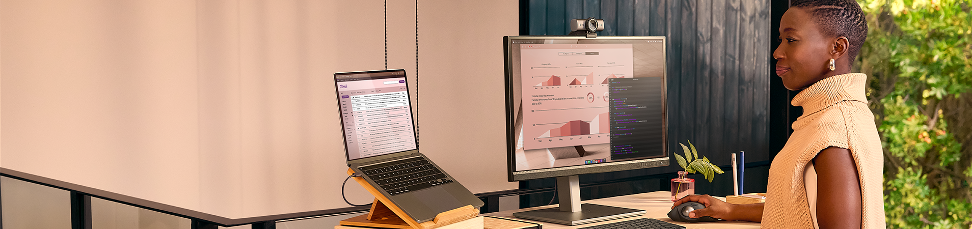 Reúnete o haz streaming de video con resolución Ultra HD 4K con mejora de imagen mediante inteligencia artificial y nuestro sensor de cámara web (hasta la fecha el más grande) para obtener imágenes 2 veces más detalladas en condiciones de iluminación difíciles.